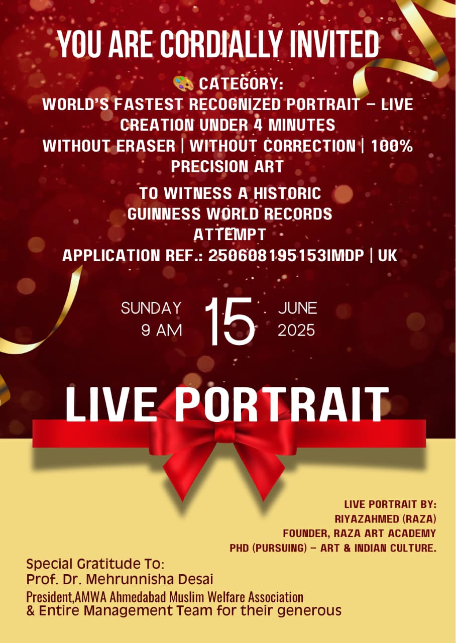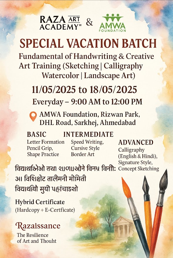 Riyazahmed Raza, known as Razaiessance™, is a visionary artist, poet and educator with over 30 years of experience in fine arts, calligraphy, poetry and heritage murals. As founder and lead educator of RAZA Art Academy in Ahmedabad, he has trained 1,400+ students across four key venues—RAZA Art Faculty & Drawing Creativity Classes (est. 2021), RAZA Art Workshop, RAZA Art Training Centre and community events like Jeevan Sandhya—empowering creative literacy and self-expression. His achievements include two original books, a grand book launch, a Guinness-record live portrait sketch attempt, and membership in the World Art Gallery USA and 65+ international galleries.